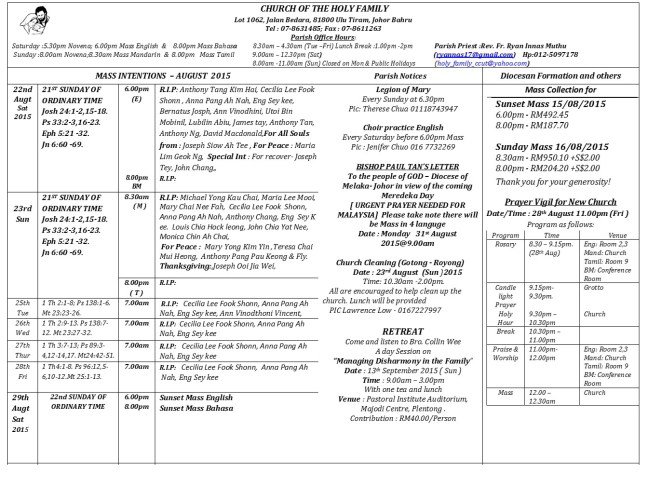 Bulletin 2015/08/22 – 21st Sunday in Ordinary Time Posted on 22 August 20154 September 2015 by Webmasterhfcut Like Loading... Related